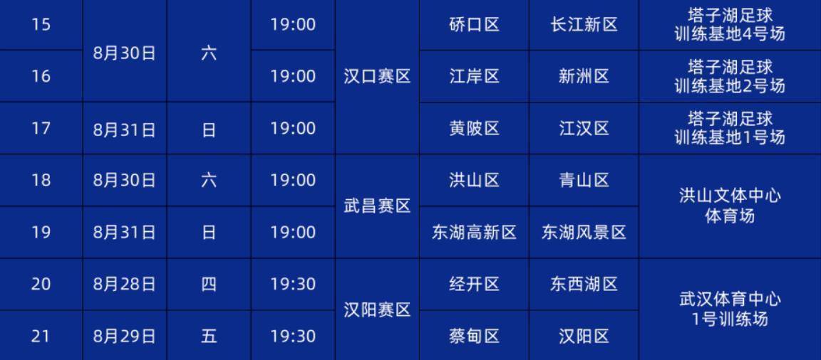 8月30日(周六)洪山区VS青山区、硚口区VS长江新区、江岸区VS新洲区;